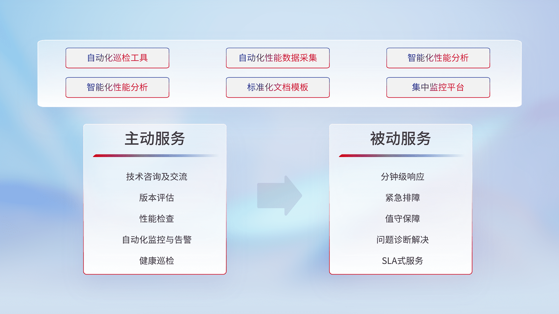 智能化工具和标准化文档,,,保障服务质量,,提供主动服务(包含技术咨询、、、版本评估、、、性能检查、、自动化监控与告警、、健康巡检)和被动服务包含(分钟级响应、、、、紧急排障、、值守保障、、、问题诊断解决、、SLA服务)。。